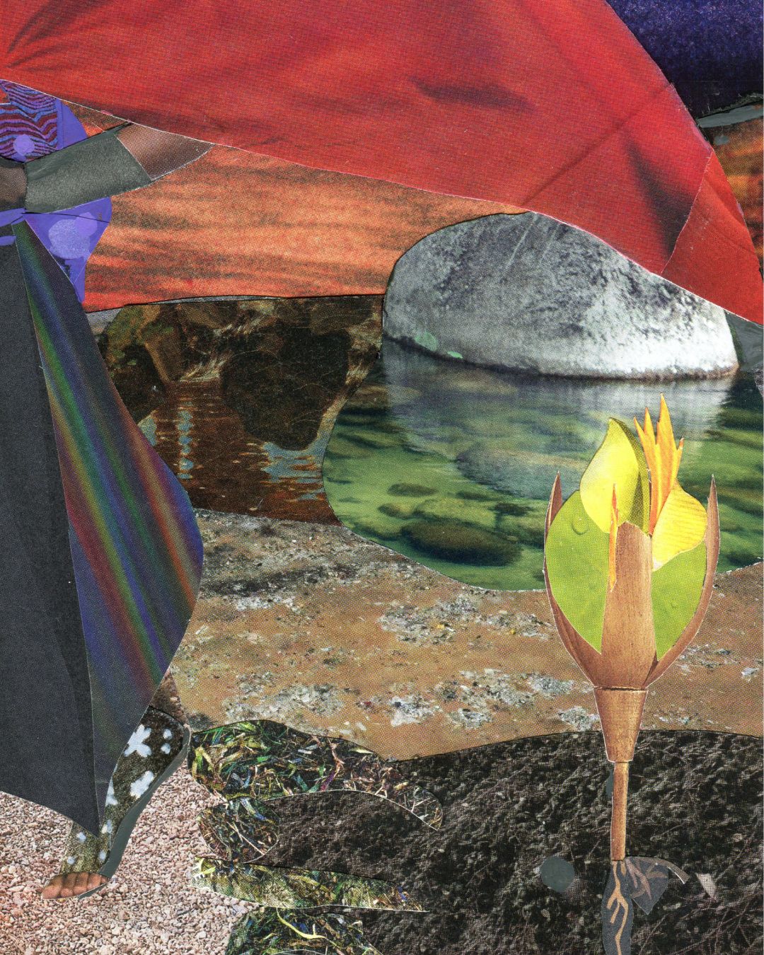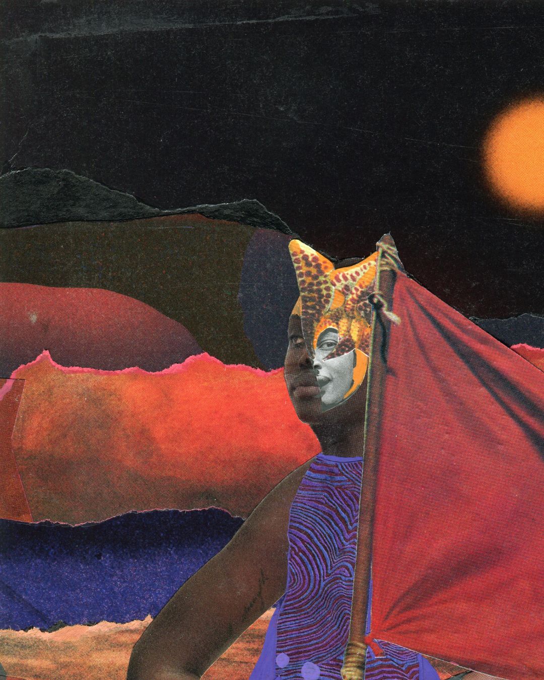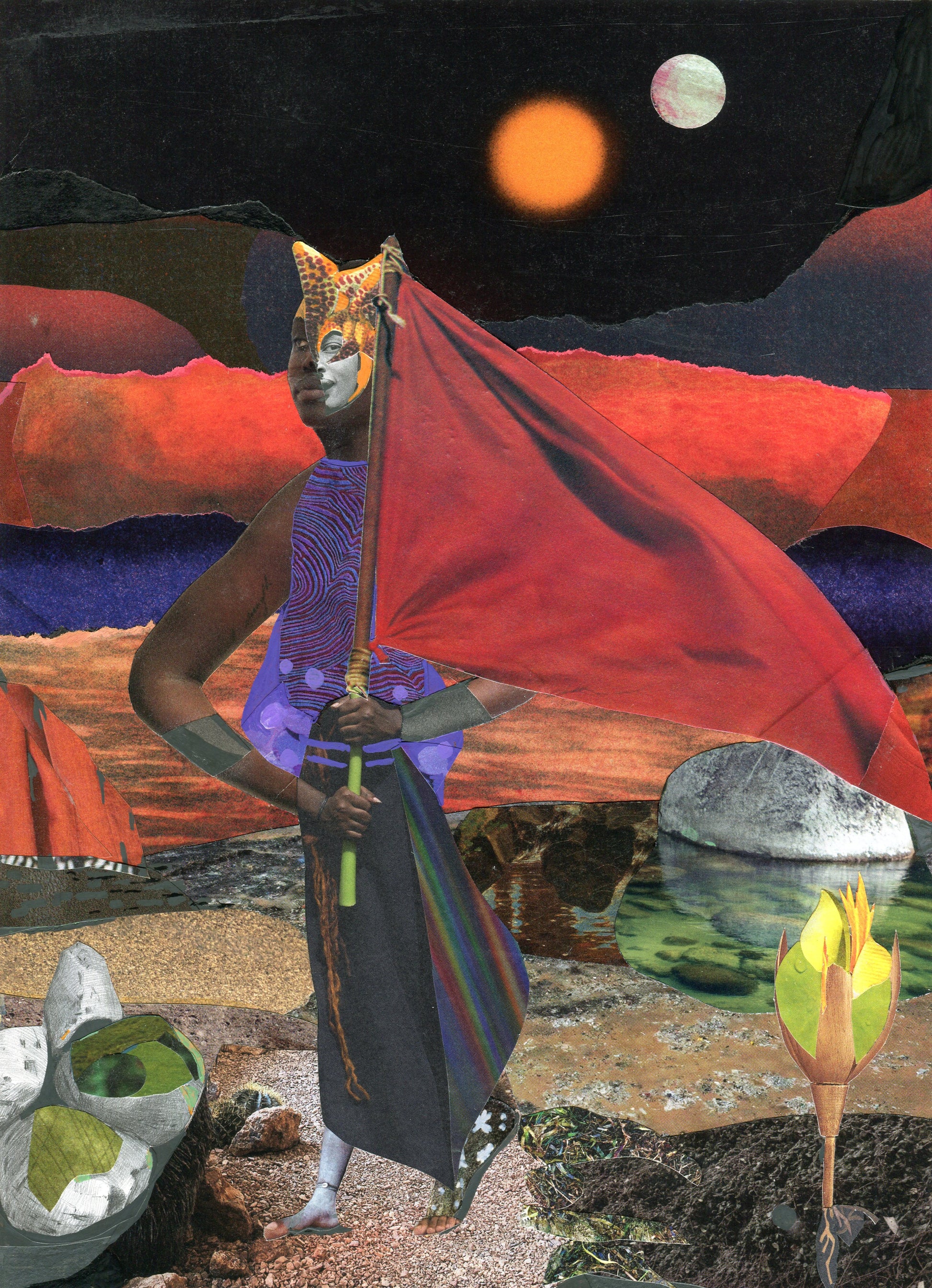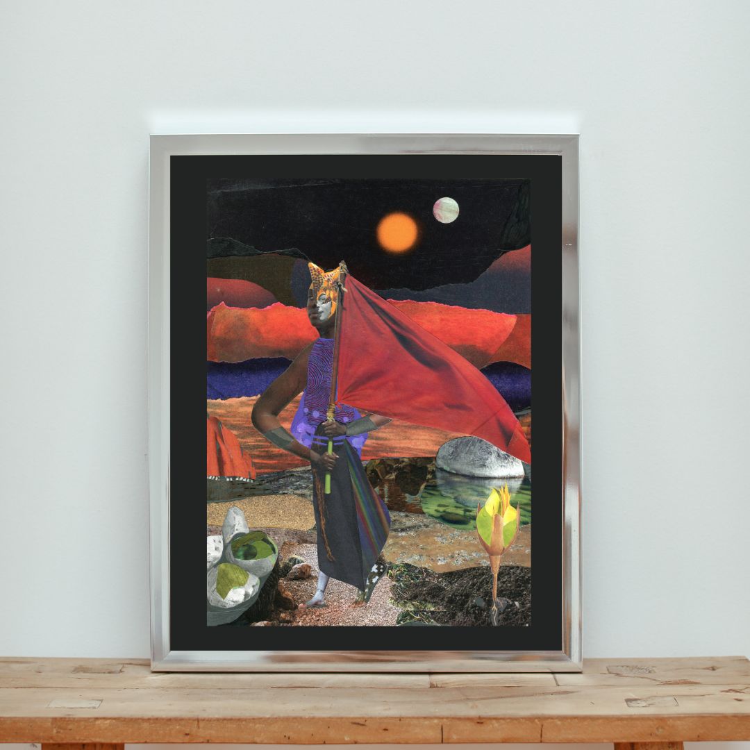 The Defender poster is on museum-quality thick matte paper. She is part of the Novel Bodies, Novel Landscapes series. She patrols the island’s rim wearing an orchid petal helmet. She’s an ever-watchful guardian of this future world where peace is hoped for but never guaranteed. She raises a red flag as a clear warning to would‑be invaders and a ready weapon if deterrence fails. The flag proclaims that every inhabitant within these shores is defended and any threat must get through her first. The original is a mixed media collage.